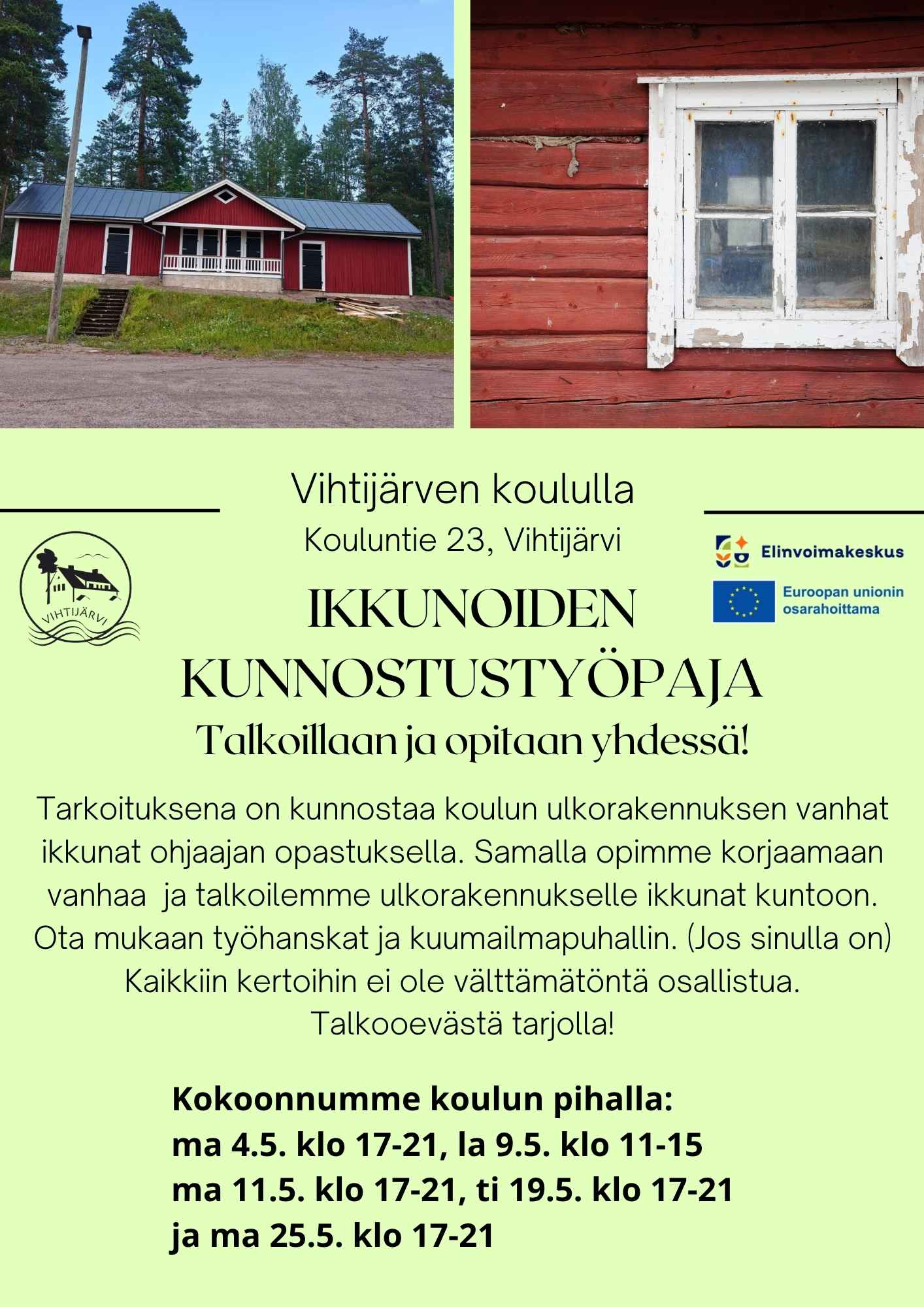 Nyt on mahdollisuus oppia vanhojen ikkunapokien ja lasien korjaamista ja samalla talkoilla Harrastustilaa Vihtijärvelle osa 2: Kämppä kuntoon -hankkeellemme.