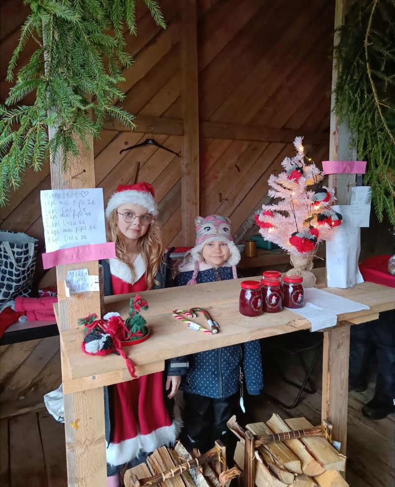 Martta ja Frida myivät itse askartelemiaan joulukuusenkoristeita. Martta oli taiteillut tontun päähän sopivia pipoja ja Frida punatulkkuja.