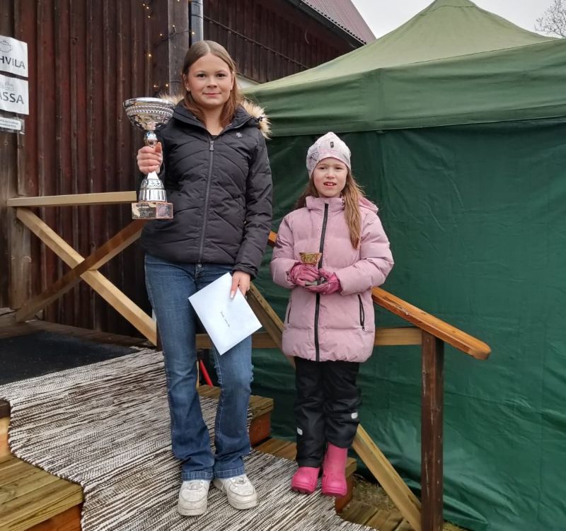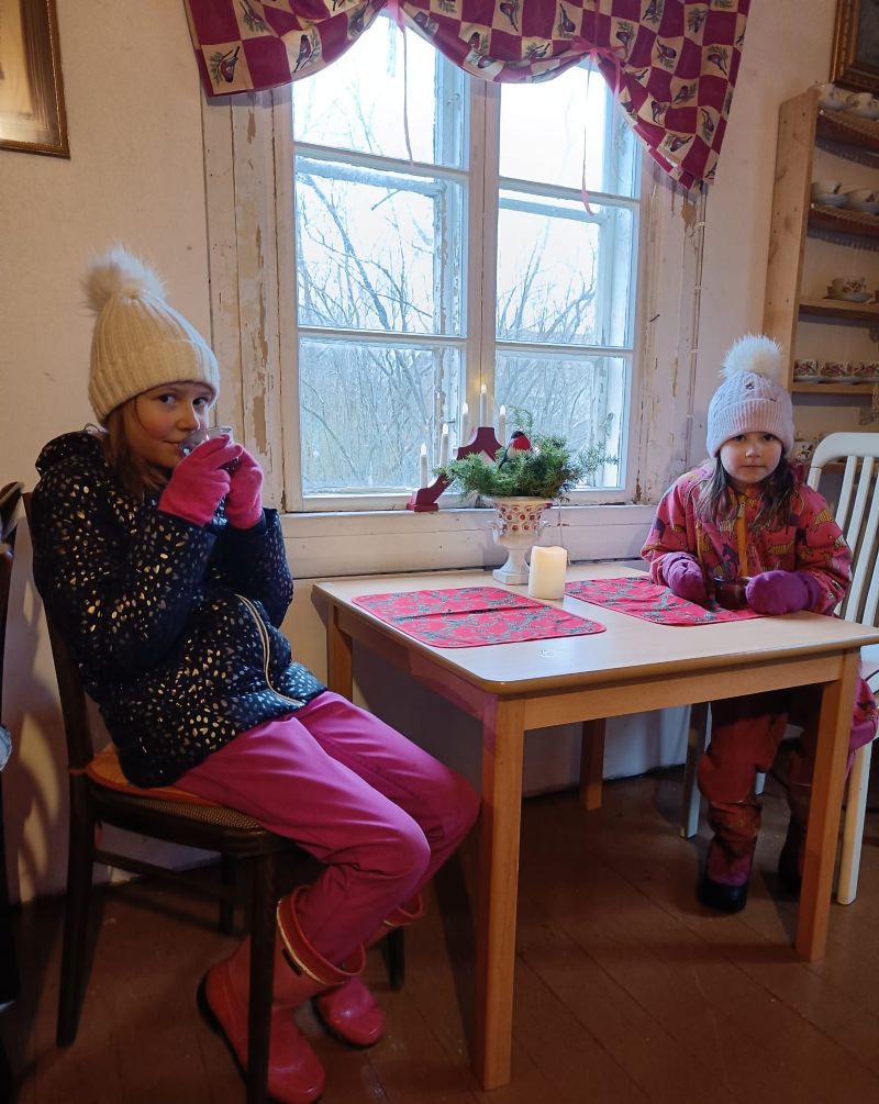 Sanna ja Suvi pistäytyivät tuvassa glögillä.