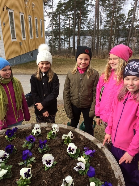 Kesäkukkaistutukset toivat kesän koulunmäelle, kun oppilaat istuttivat jokainen oman orvokkinsa koristamaan pihaa. Viileä sää piti pintansa vielä viime torstain istutuspäivänä, ja pian työn valmistuttua saatiinkin pieni raekuuro. Onneksi orvokit eli Violat eivät ota kylmästä niin nokkiinsa, todettiin istutustyön lomassa. Samalla kerrattiin muutakin kasvitietoutta: vettä, ravinteita ja lämpöä pitää olla, jotta elinvoima säilyy.
