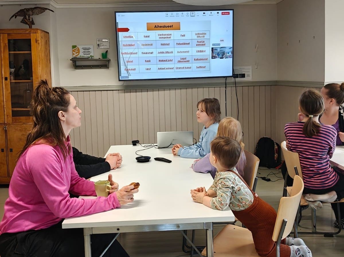 Ruokailun aikana kylätalolle saapui vielä vähän varttuneempaakin väkeä ja näin saatiin kokoon hyvät joukkueet tietovisa varten. Anu piti hauskan koko perheen tietovisan meille etäyhteydellä Espanjasta käsin.
