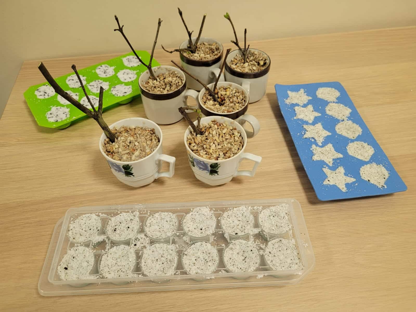 Pikkulinnuille ruokintakuppeja – kupin korvaan tulevat narut oksaan ripustamista varten vielä puuttuvat näistä, mutta muuten valmiit herkkupaikat odottavat talven vieraita.